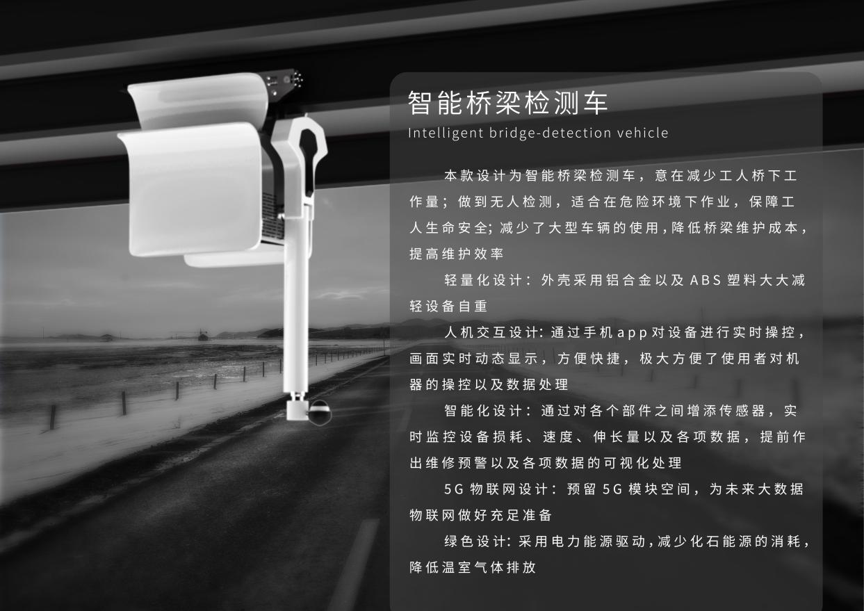 本款設(shè)計為智能橋梁檢測車,意在減少工人橋下工作量;做到無人檢測,適合在危險環(huán)境下作業(yè),保障工人生命安全;減少了大型車輛的使用,降低橋梁維護成本,提高維護效率。