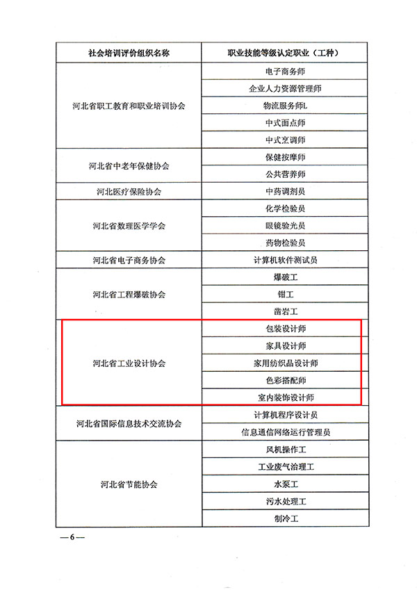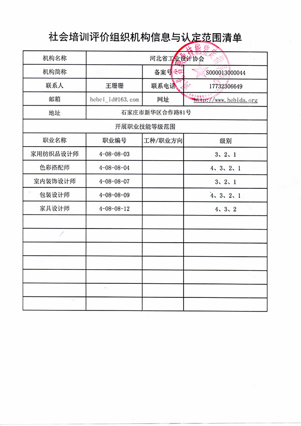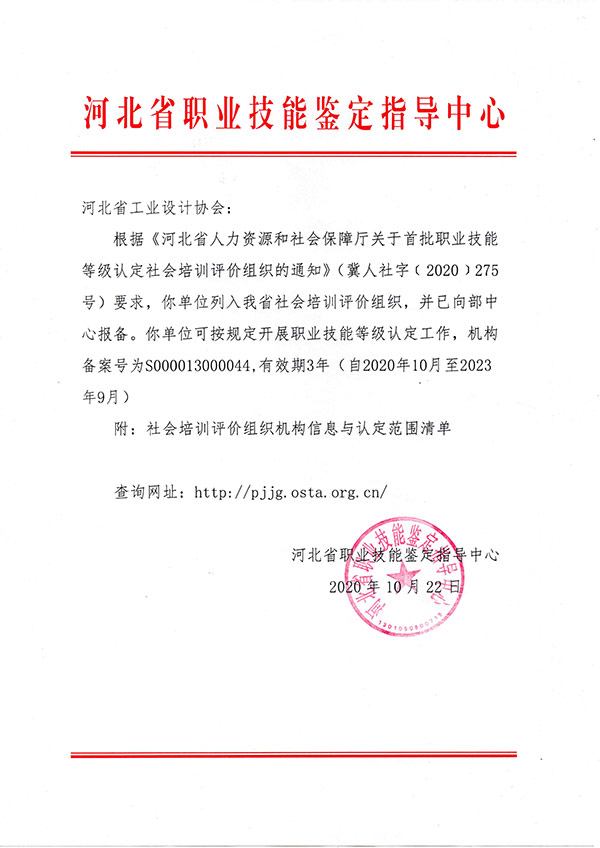 河北省工業設計協會是由河北省人力資源和社會保障廳批準的河北省首批職業技能等級認定社會培訓評價組織和認定機構,機構備案號為:S000013000044,是開展包裝設計師、家具設計師、室內裝飾設計師、家用紡織品設計師、色彩搭配師等五個職業技能評價和認定的唯一機構。