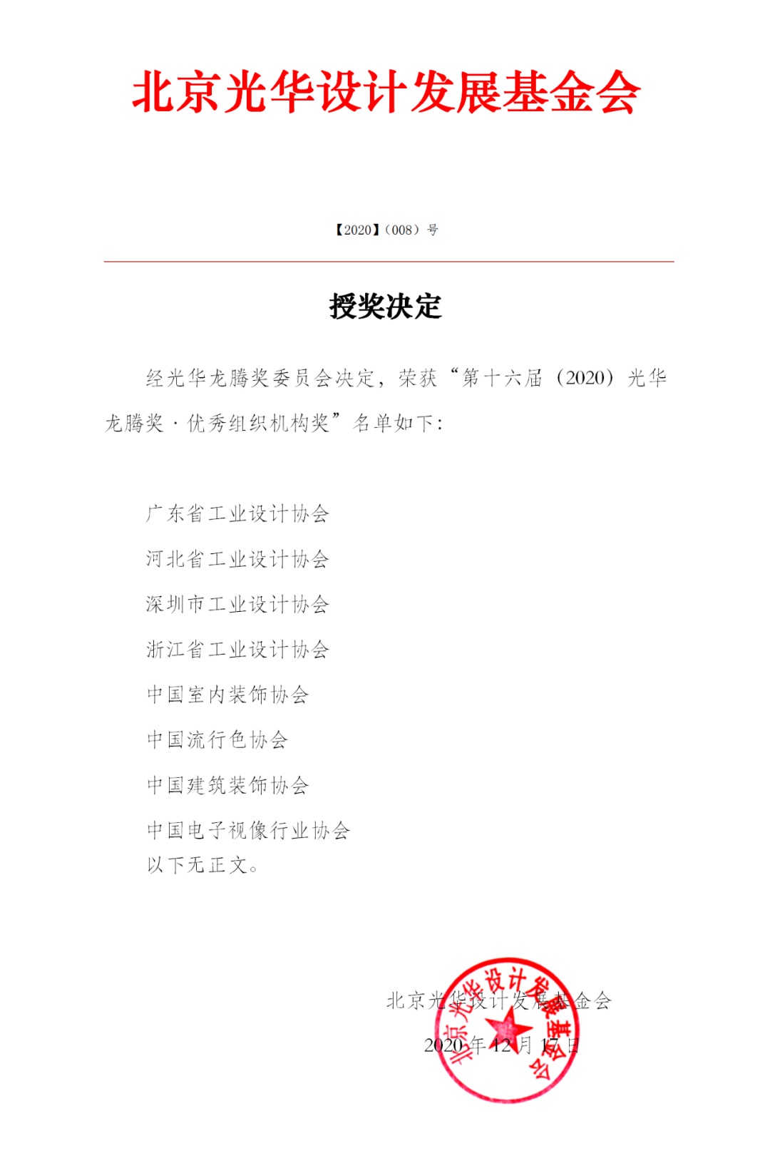 12月17日上午,第十六屆(2020)光華龍騰獎頒獎典禮在國家會議中心隆重舉行。光華龍騰獎是經國家獎勵辦批準的中國設計領域人才表彰國家級獎項(獎勵編號:國 科獎社證字第0223號)。2004年在團中央支持下創立,2010年交北京光華設計發展基金會管理,至今已評選16屆。光華龍騰獎以“發現優秀設計人才,樹立自主創新楷模”為宗旨,十六年間光華龍騰獎承載推動中國創新設計發展的歷史使命,覆蓋規劃、工程、建筑、交通、景觀、產品、服飾、多媒體、服務設計等18大設計門類,表彰“中國設計業十大杰出青年”150人,“中國設計貢獻獎”金質、銀質獎章獲得者300余人,“龍騰之星”及系列獎項獲得者20000人以上。領航2000萬設計從業者,帶動社會經濟價值數萬億。光華龍騰獎表彰的設計人才都是創新設計各領域的領軍人物,對助力地方設計業發展,進而帶動地方創新發展會起到重要引領作用;在推進國家科技創新,建設科技強國,實現中華民族偉大復興過程中,具有引領帶動和關鍵性支撐作用。